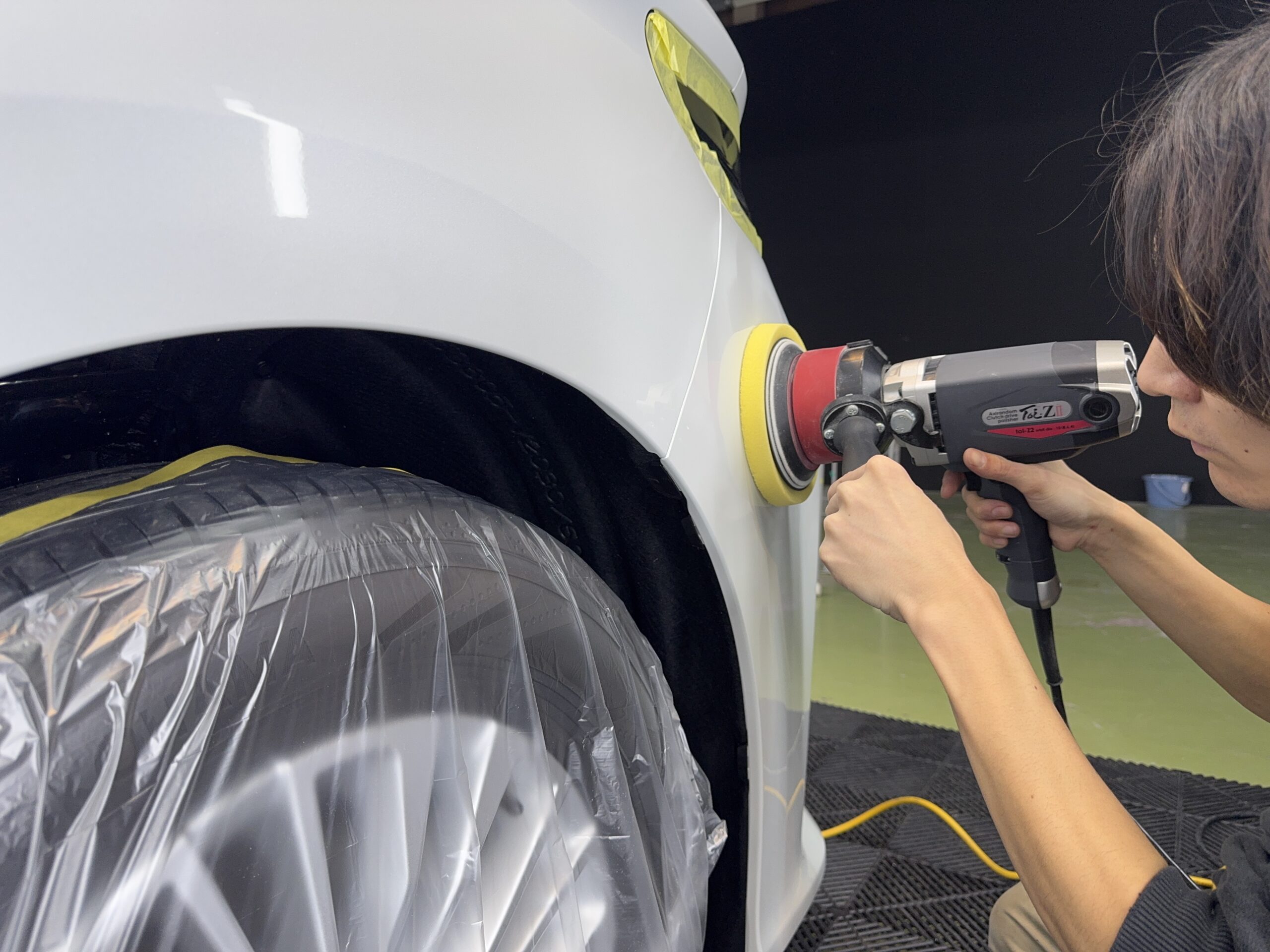 新車でも現車確認などをしっかり行い、傷等無いか確認を行ってから下準備作業に入っていきます。マスキングで磨いては行けない所を養生し、研磨作業に移ります!